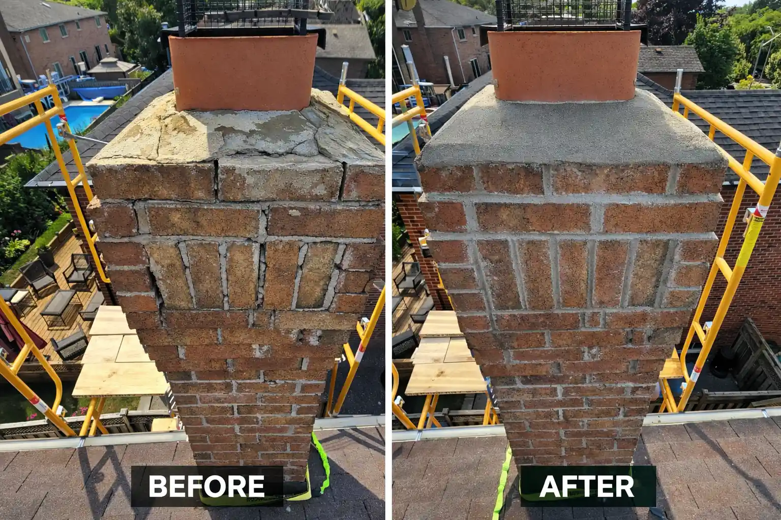 These before and after examples show how damaged chimneys are repaired or rebuilt to restore structural stability, improve appearance, and ensure safe long-term performance.