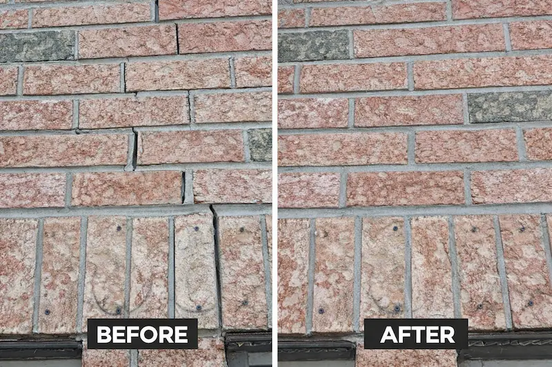 These before and after examples show how deteriorated mortar joints are restored through tuckpointing and repointing to improve stability and support long-term performance.